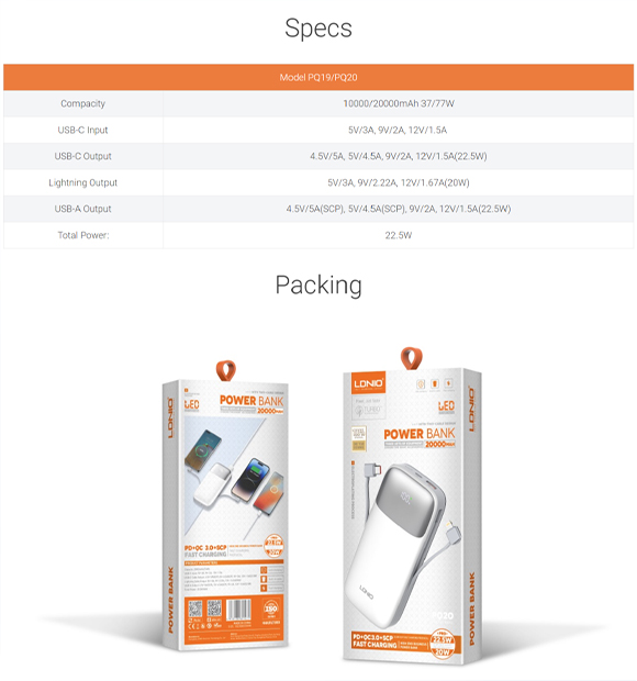 LDNIO Power Bank With Built-In Cable 10000mAh - 50000mAh (PQ19 / PQ20 / PQ30 / PQ50)