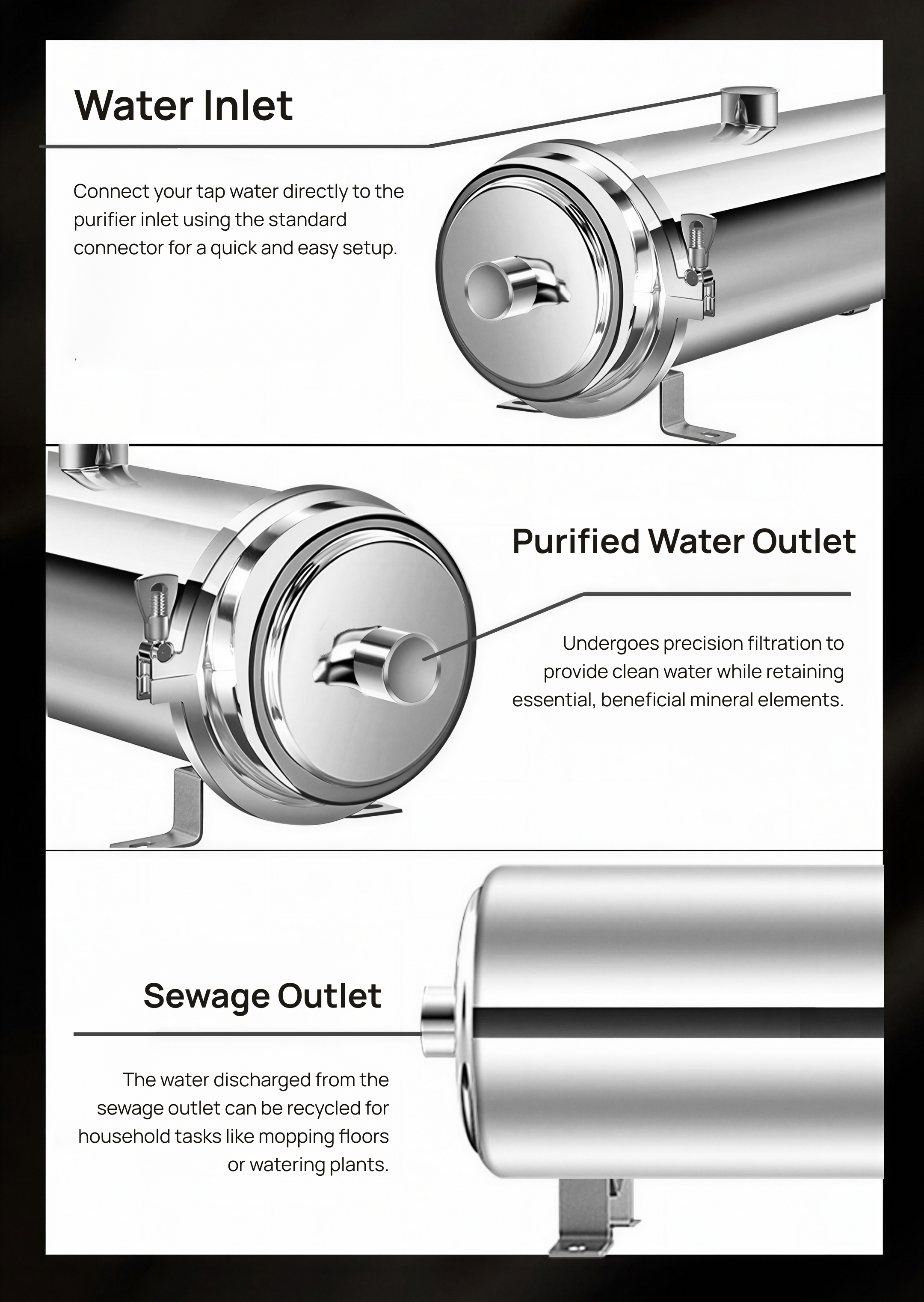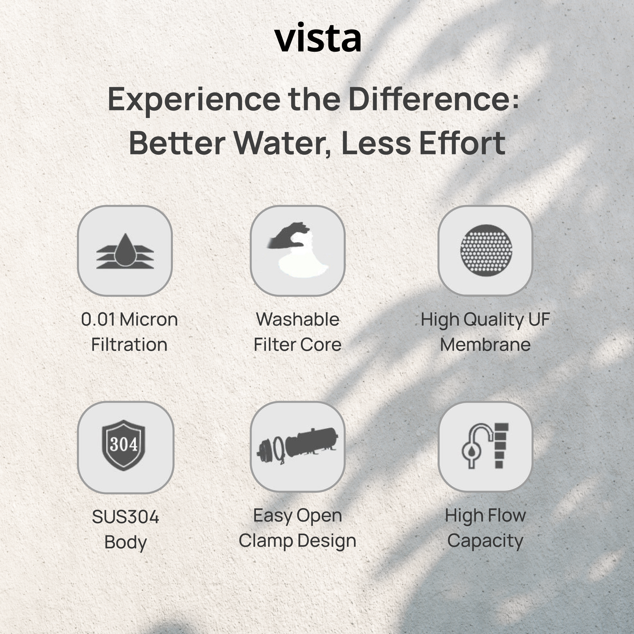 Feature: Dechlorination, removes heavy metals, rust, sediment, bacteria, sand